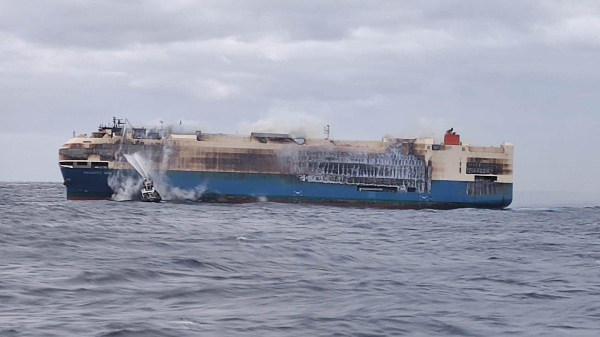 Felicity Ace, kapal kargo raksasa yang mengangkut ribuan mobil mewah melintasi Samudera Atlantik, terbakar.