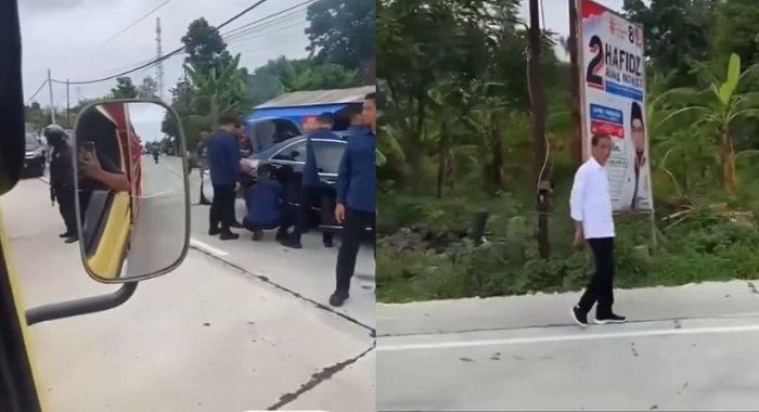 Dalam video yang beredar, Presiden Jokowi terlihat mengenakan kemeja putih dan celana hitam berdiri di pinggir jalan tak jauh dari lokasi mobil kepresidenan berhenti.