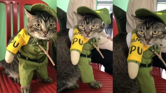 Dalam video tersebut tampak seekor kucing yang tampil menggemaskan dengan menggunakan kostum seragam Linmas berwarna hijau.