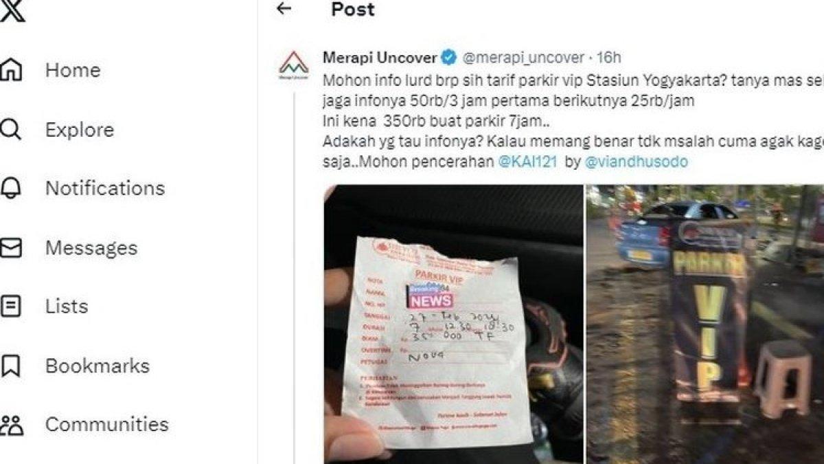 Harga tarif parkir VIP di Stasiun Tugu Yogyakarta diposting di akun media sosial X (Twitter) @merapi_uncover pada Selasa (27/2/2024) lalu.