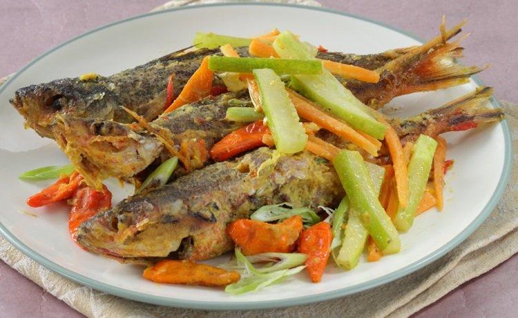- Lumuri ikan dengan garam dan air jeruk nipis. Diamkan 15 menit. Tiriskan. Goreng ikan sampai matang, angkat, tiriskan. Sisihkan.