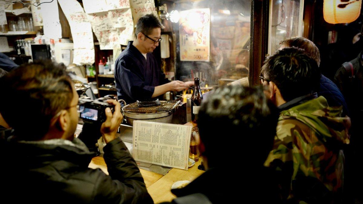 Di izakaya Osaka ini, terdapat dua belas kursi konter di lantai satu dan dua, tempat kamu dapat menyaksikan makanan dipanggang.