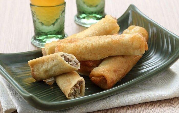 - Ambil selembar kulit. Beri adonan isi. Lipat dan gulung.