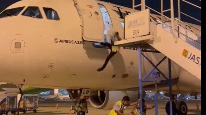 Video yang beredar menunjukkan seorang petugas yang tengah beridir di pintu psawat.