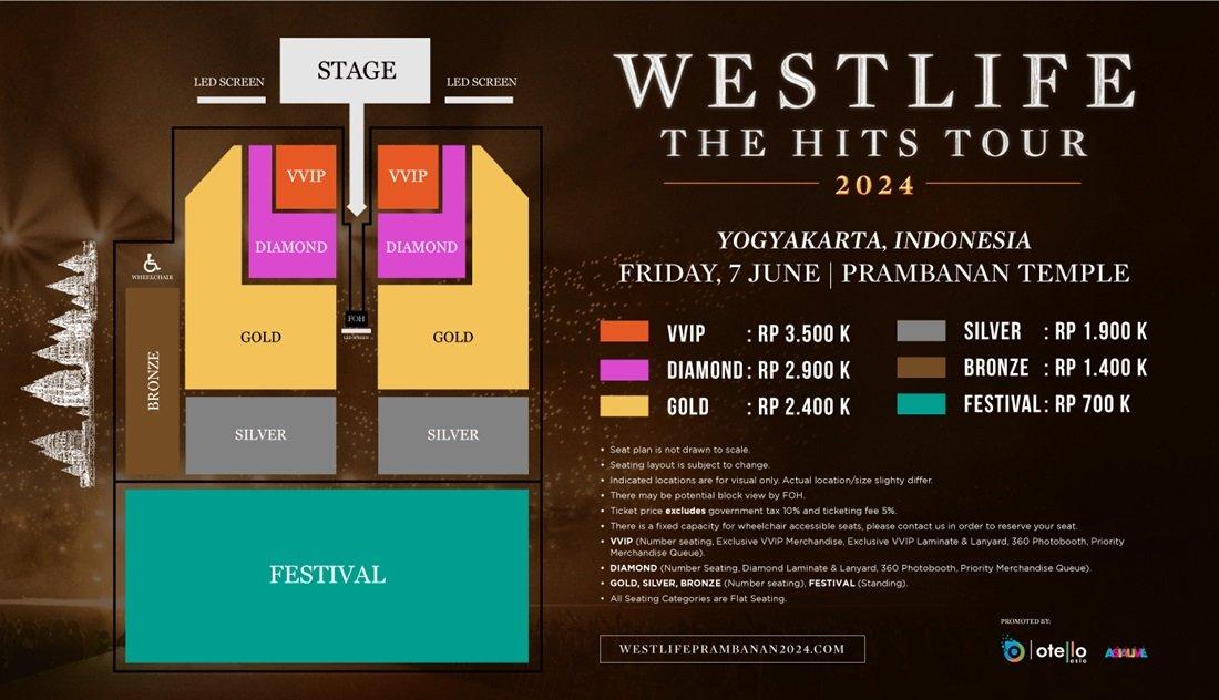- Tiket hanya dapat dibeli melalui www.westlifeprambanan2024.com. Tiket hanya dapat digunakan untuk masuk ke acara konser Westlife The Hits Tour 2024 di Candi Prambanan Yogyakarta.