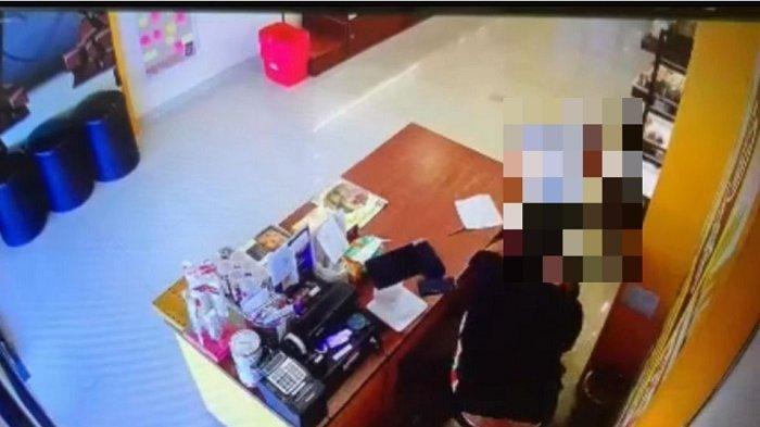 Dalam rekaman CCTV tampak seorang wanita tengah berdiri di balik meja kasir.