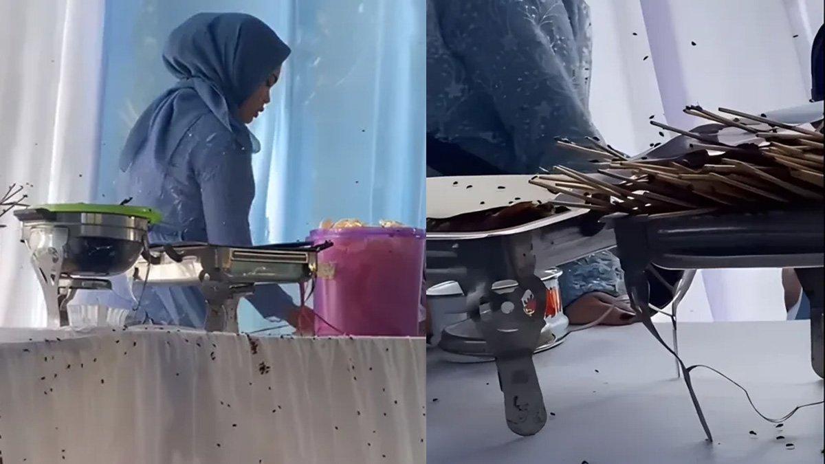 Dari video yang diunggah terlihat juga beberapa orang yang berjaga di depan gubuk makanan, mereka mencoba membersihkan lalat.
