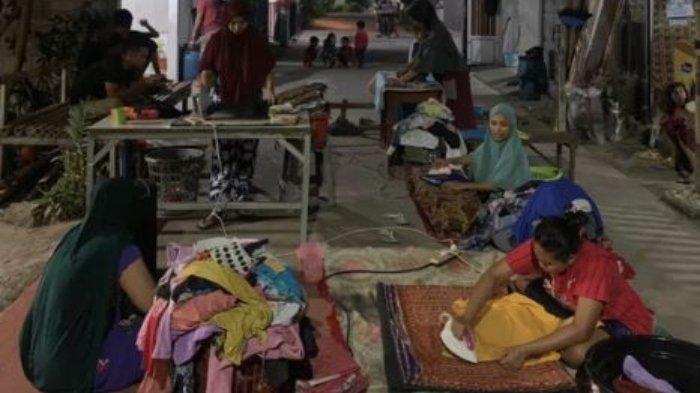 Setidaknya terdapat 5 ibu-ibu tampak memenuhi jalanan di depan rumahnya, dimana tiga diantaranya tampak duduk sembari membawa tikar dan dua lainnya tampak membawa meja untuk menyetrika.