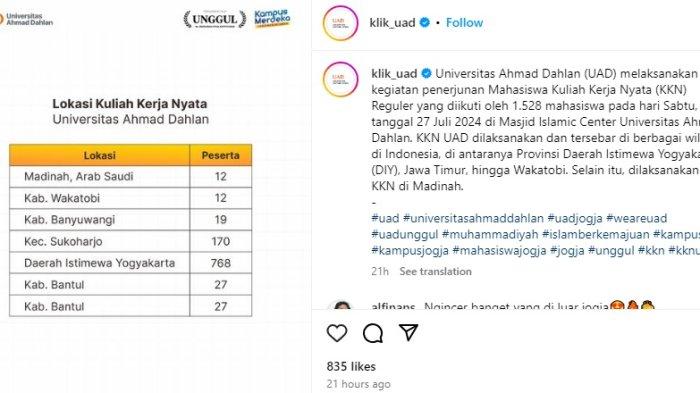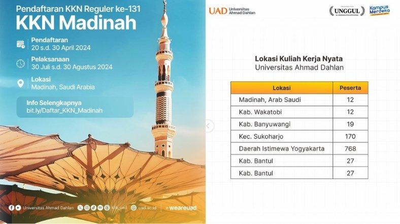 "KKN UAD dilaksanakan dan tersebar di berbagai wilayah di Indonesia, di antaranya Provinsi Daerah Istimewa Yogyakarta (DIY), Jawa Timur, hingga Wakatobi. Selain itu, dilaksanakan juga KKN di Madinah," tambah akun tersebut.