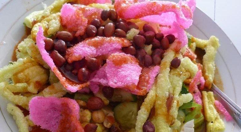 Asinan Betawi berisi toge, kacang tanah, sawi, kol, tahu, wortel timun, tahu, kerupuk pink, dan kuning.