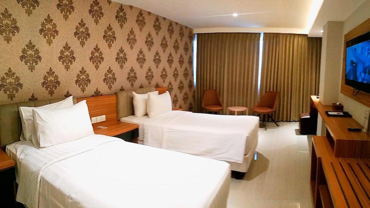 Fasilitasnya, yaitu sarapan gratis 2 orang, 2 kasur single, shower, air mineral kemasan, free WiFi, fitness center, layanan kamar, kedai kopi, karaoke, dan sebagainya.