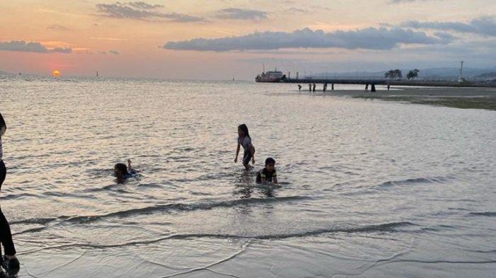 Terlihat anak-anak bermain di pinggir pantai bersama keluarga mengingatkan salah satu pengunjung, Dio (24) saat masih kecil bersama sang ayah.
