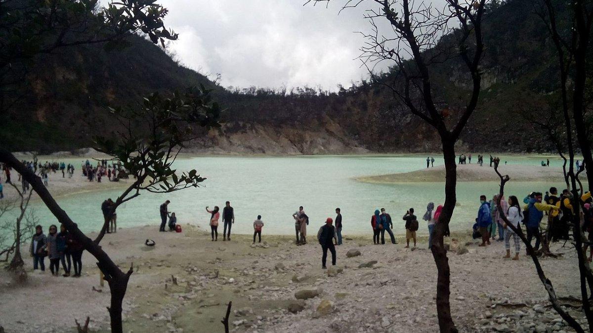 Kawah Putih menawarkan pemandangan spektakuler dengan danau kawah berwarna putih kehijauan.