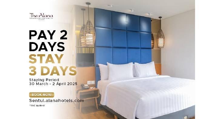 TRIBUNTRAVEL.COM - Menyambut kemeriahan Hari Raya, The Alana Sentul menghadirkan promo spesial yang sayang untuk dilewatkan! Bagi para tamu yang ingin menikmati liburan dengan lebih hemat dan nyaman, hotel bintang 4 ini menawarkan penawaran eksklusif: Bayar untuk 2 Malam, Menginap 3 Malam, termasuk sarapan untuk dua orang.