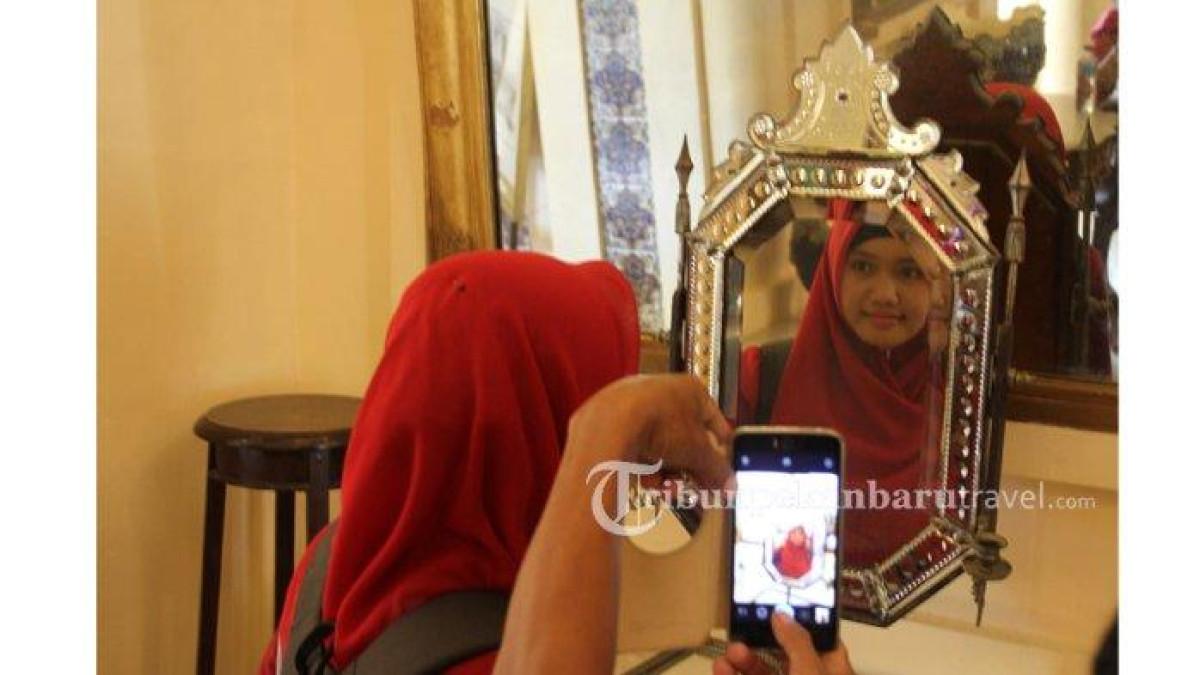 Ayu, seorang pengunjung Istana Siak yang datang dari Kota Pekanbaru bersama keluarganya juga tak mau kalah ikut memotret diri sambil berkaca di cermin permaisuri,