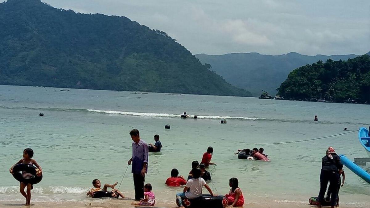 Banyak pengunjung datang bersama keluarga untuk menikmati suasana pantai sambil bersantai di bawah pohon kelapa.