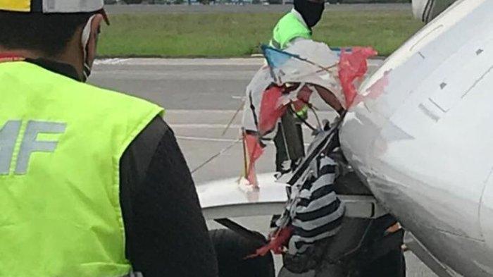 Layang-layang menyangkut di sebuah pesawat maskapai Citilink yang mendarat di Bandara Internasional Adisutjipto Yogyakarta.
