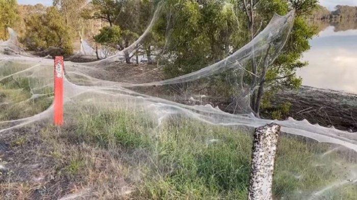 Pedesaan di kawasan Victoria timur, Australia terlihat diselimuti oleh jaring laba-laba halus.