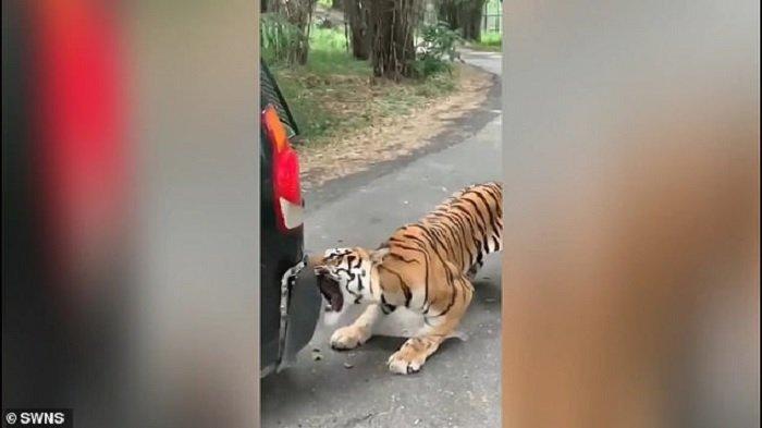 Wisatawan ini merekam aksi harimau Bengal besar menggigit bumper mobil safari. Bahkan harimau Bengal itu bisa menarik mobil dengan giginya.