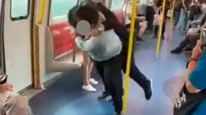 Rekaman video pertengkaran yang berlangsung sekitar satu menit dimulai dengan dua pria saling meninju di tengah gerbong kereta di Hong Kong.