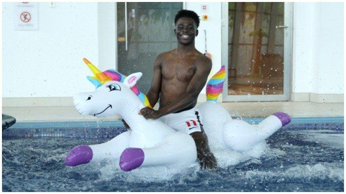 Viral Bukayo Saka yang sedang asyik main air di St George's Park National Football Centre dengan pelampung unicorn.
