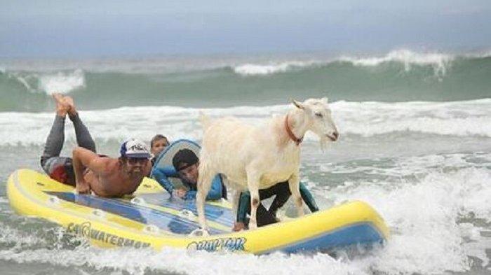 Seekor kambing di California memiliki pekerjaan yang cukup unik, yakni sebagai instruktur selancar.