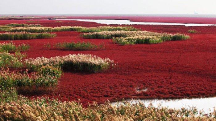 Dikutip TribunTravel.com dari laman worldatlas.com, warna merah di kawasan Red Beach disebabkan oleh hamparan tanaman Suaeda Salsa.
