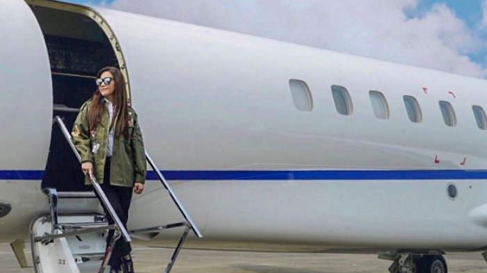 Maia terlihat tampil modis dengan paduan busana bergaya kasual saat naik pesawat jet pribadinya. Segini harga outit-nya.