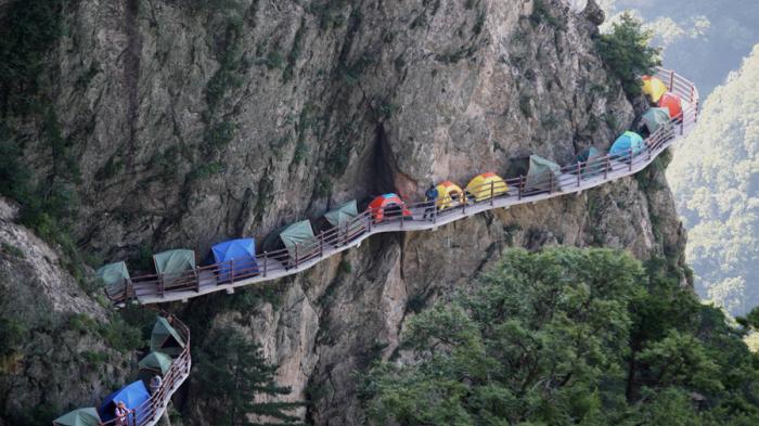 Inilah tempat kemah ekstrem di dunia. Bagaimana tidak, tempat kemah tersebut berada di setinggi 1.700 meter di tebing Gunung Laojun.