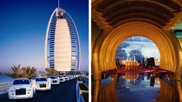 Ialah Hotel Burj Al Arab di Dubai yang mendapat julukan tersebut karena fasilitasnya yang fantastis sekaligus menjadi ikon kemegahan Dubai