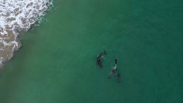 Seorang perempuan yang sedang berenang di perairan Pantai Hahei di Selandia Baru ini tidak menyangka akan diiringi oleh tiga ekor paus.