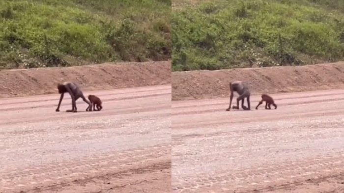 Video viral memperlihatkan orang utan bertubuh kurus kering berjalan dengan anaknya keluar hutan dan melintasi jalan.