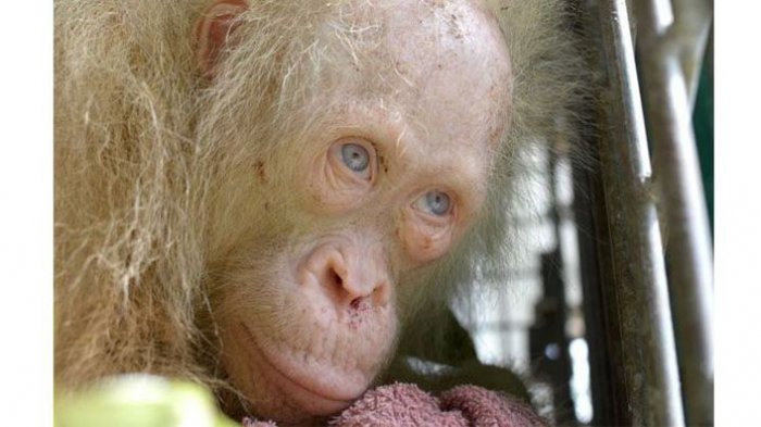 Orangutan albino yang sangat langka, memiliki rambut pirang dan mata biru, telah diselamatkan di Kalimantan.