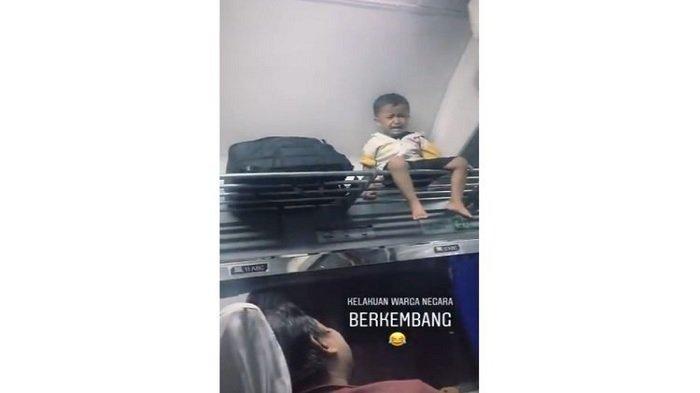 Sebuah video yang memperlihatkan seorang anak kecil yang duduk di rak bagasi gerbong kereta api viral di media sosial Twitter pada Jumat (31/1/2020).