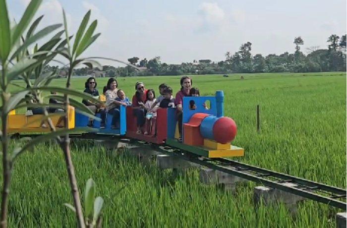 Lokamerta di Desa Tirtomarto, Kecamatan Cawas, Kabupaten Klaten, Jawa Tengah menawarkan wahana kereta api yang berjalan melintasi lahan persawahan.