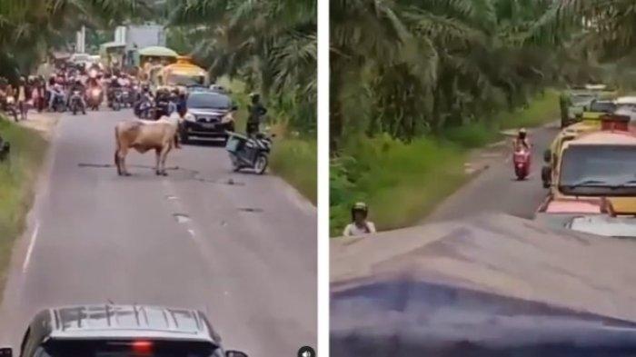 Dalam video itu terlihat seekor sapi yang berdiri melintang di sebuah jalan raya. Sapi berukuran cukup besar itu tidak mau bergerak sama sekali.