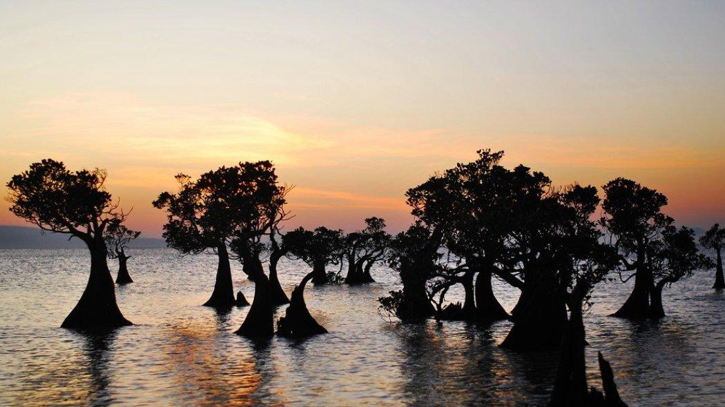 Saat matahari tenggelam, Pantai Walakiri menawarkan lanskap dramatis dengan siluet pohon bakau.