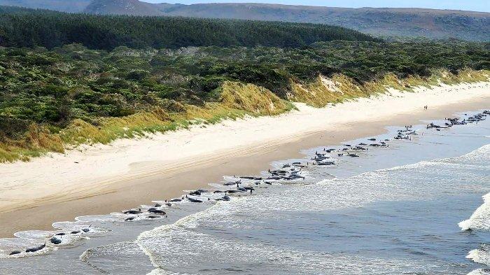 Total sebanyak 230 paus terdampat massal di pesisir barat Tasmania, Australia dengan kondisi hanya 35 ekor yang bisa diselamatkan.