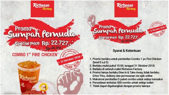 Masih dalam rangka memperingati Hari Sumpah Pemuda pada 28 Oktober lalu, Richeese Factory membuat kembali promo harga spesial.