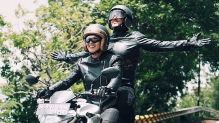 Dalam foto, terlihat finalis Miss Universe dan Hamish Daud mengenakan jaket hitam dan mengendarai sepeda motor.