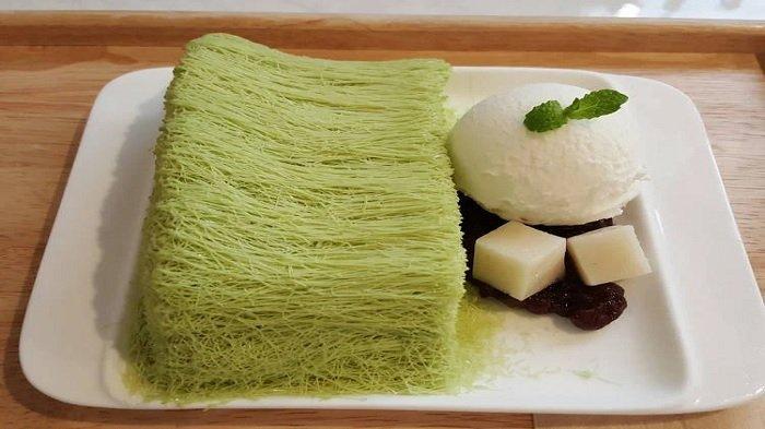 Hidangan manis bernama Shiltarae Bingsu yang cukup unik karena tampilannya seperti mi beras super tipis.