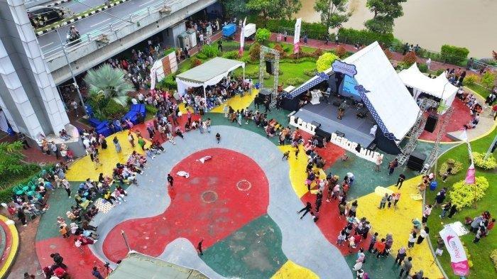 Sebuah gunungan atau tumpeng tahu setinggi 8,5 meter menjadi rebutan pengunjung kawasan Simpang Lima Gumul, Kabupaten Kediri, Minggu (30/12/2018).