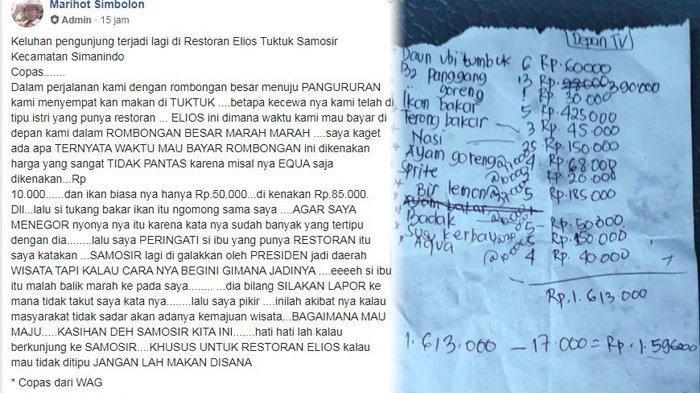 Keluhan tersebut diunggah salah satu akun Facebook di Grup Facebook Patre Samosir. Pemilik akun juga mengunggah foto struk makanan yang harus dibayar