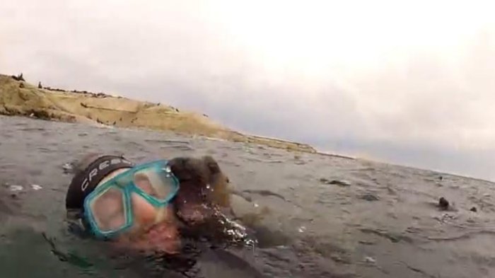 Rekaman tersebut juga memperlihatkan anjing laut yang mencoba menarik masker yang dipakai si pria. Ia pun menghampiri pria yang bermain snorkling.
