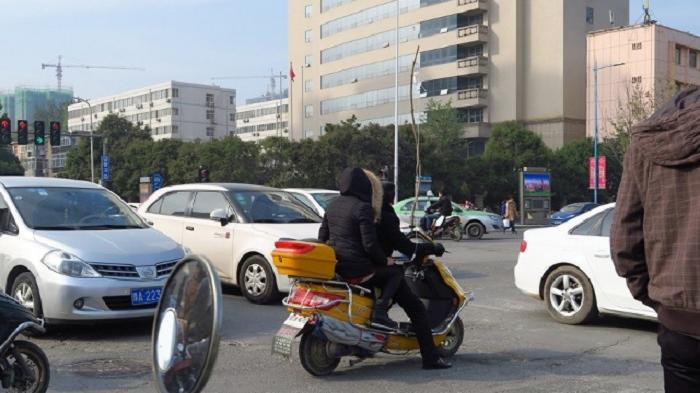 Sebuah foto di jalanan Kota Zhengzou menunjukkan seorang pria dan wanita yang tengah berboncengan dengan skuter.